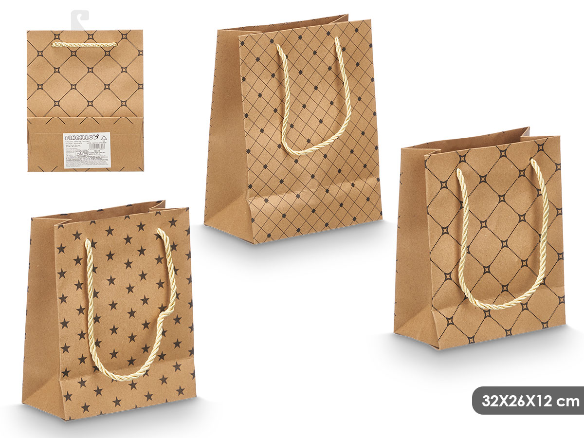 Vendido en cajas de 12 unidadesBolsa asa kraft surt 3 estampados 32x26x12cm